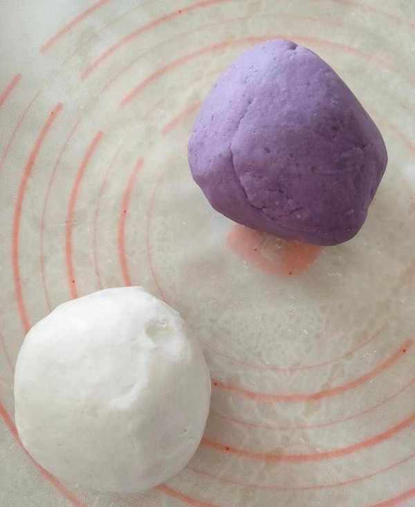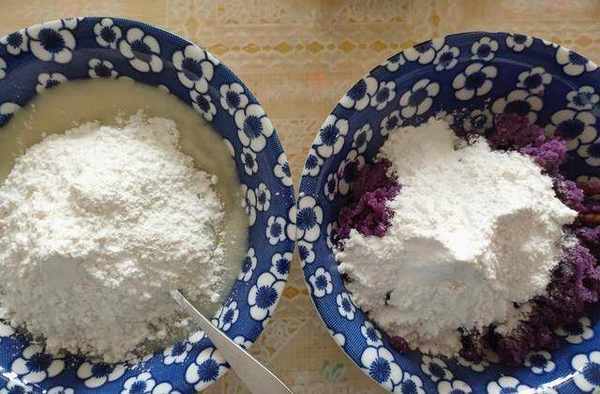 4、分別加糯米粉和木薯粉,糯米粉和木薯粉的比例是1:2。山藥需要的粉量比較大,即使加瞭很多粉類還是比較粘手,放冰箱冷藏一晚上比較好操作。但紫薯幹,隻需要加少量粉就可以,冰箱冷藏一晚後變得更幹。所以建議做的時候先蒸好山藥,加粉拌好後蓋上保鮮膜冷藏一夜再做。紫薯現蒸現做。