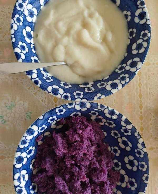 3、用料理機將山藥打成泥狀。山藥的品種不一樣做法不一樣,如果是鐵棍山藥可以直接按壓成泥。這種水山藥隻能攪拌成山藥泥。紫薯去皮壓成泥。