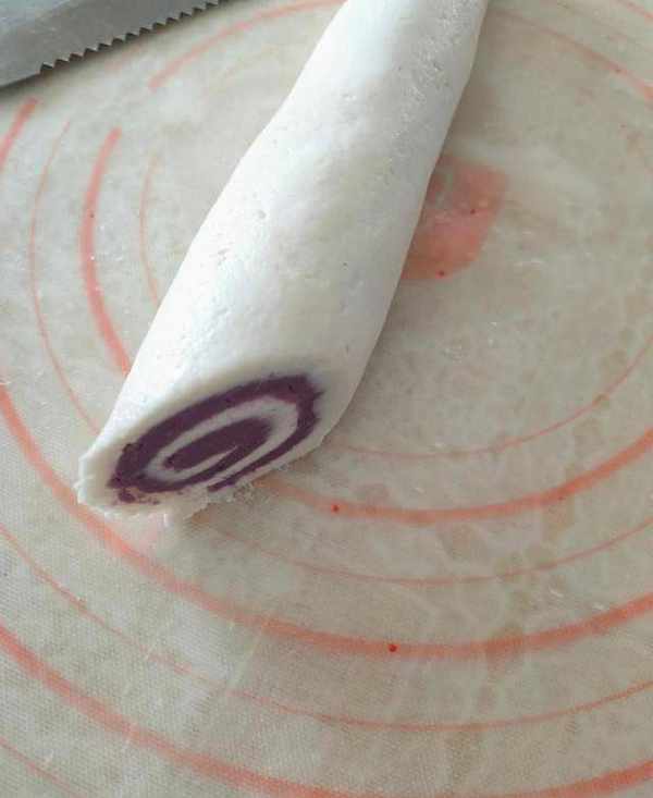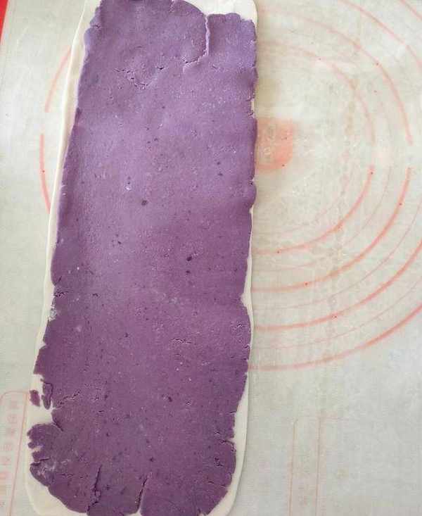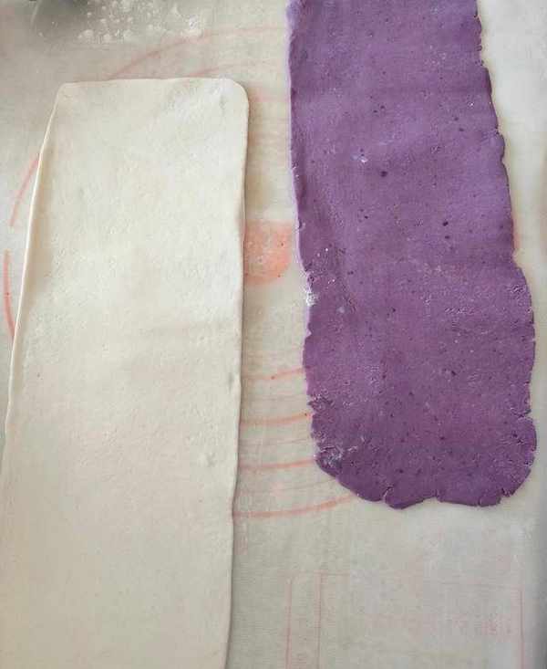6、矽膠墊抹油,將紫薯面團和山藥面團搟開成長方形。搟的時候邊搟邊用塑料刮刀將邊緣處整理成直線。
