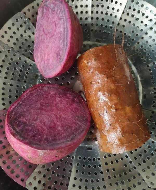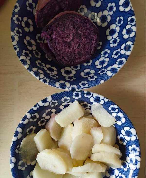 2、蒸熟後的紫薯和山藥,山藥去皮削成小塊。