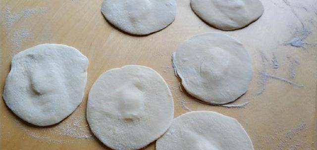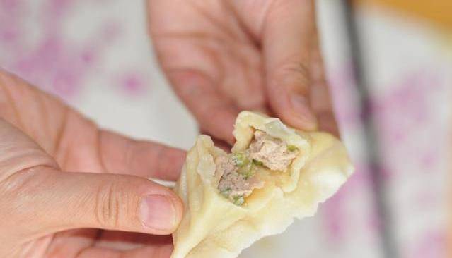面皮放入肉餡,對折面皮,捏緊邊緣,左右手的拇指和食指捏住,往中間擠壓,出來一個大肚子,最簡單快捷的包餃子方法,包好的餃子