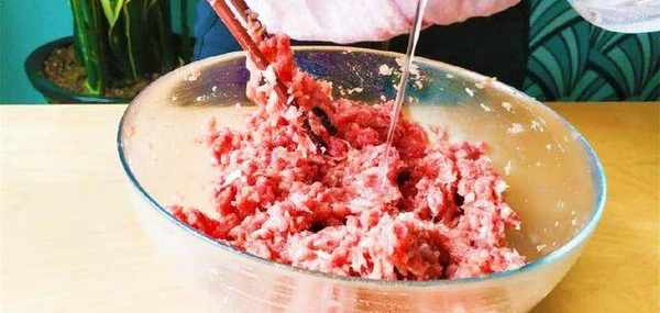 往肉餡裡分3次加入適量的清水,順著一個方向攪拌均勻上勁,使肉餡更佳入味