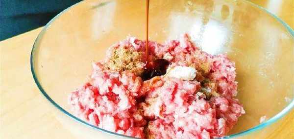 剁好的肉餡,加入料酒,白糖,醬油,五香粉,芝麻油,鹽一點,順著一個方向攪拌上勁