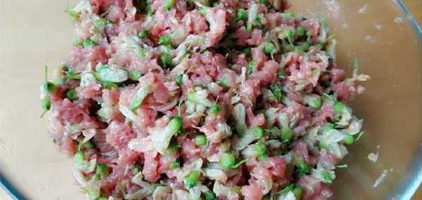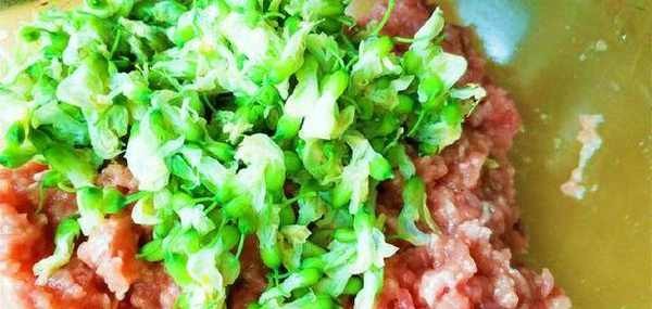 順著一個方向攪拌混合均勻。(槐花現在放入,是為瞭不被肉餡裡的鹽醃焉,不被調味料蓋住槐花的香味,這樣能夠保持槐花的香味和鮮度)