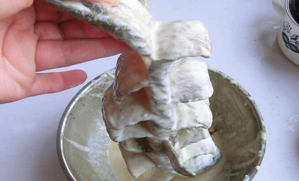 4、給魚掛糊,這一步要註意,在表面均勻地塗抹一層就可以瞭,要均勻抹在醃好的魚上,不用往肚子裡抹。