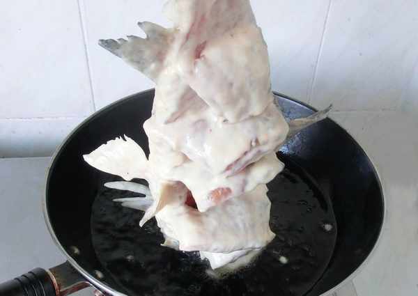 5、油燒至七成熱,,提起魚尾,先將魚頭入油稍炸,記得把魚鰓也盡量撐開。再用勺舀油淋在魚身上,待面糊凝固使頭尾翹起的造型定住,再把魚慢慢放入油鍋內,此時油溫大概4成,不要太高,利用油溫慢慢上升的過程定型。