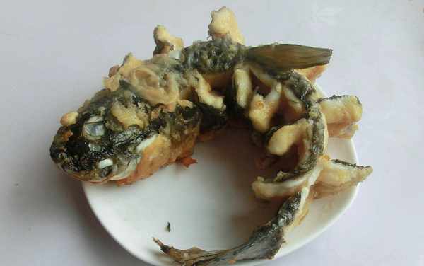 6、大概七八分鐘魚就炸好瞭,撈出來。