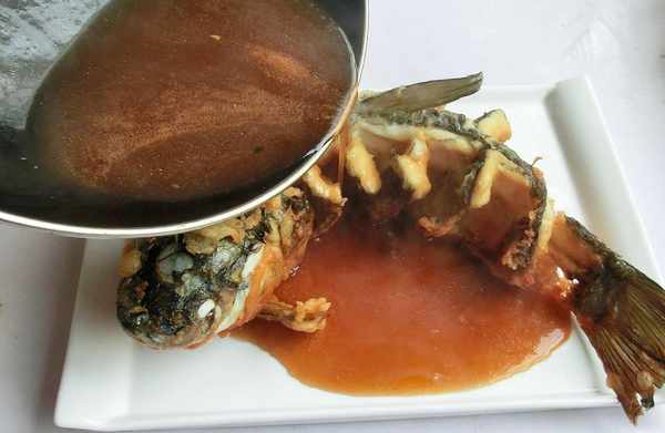 9、將糖醋汁均勻地淋在魚身上,趁熱上桌。
