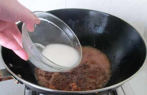 8、鍋中放入少許底油,爆香蔥薑蒜,倒入之前調好的碗汁和番茄醬。這時就可以體現提前調好碗汁的關鍵。燒開後加少許濕淀粉將汁收濃,濃稠把握在流水芡的程度即可。