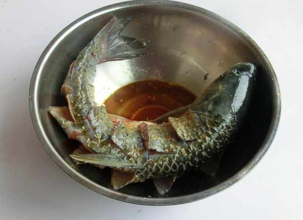 做法:1、選2斤重黃河鯉魚一條,宰殺幹凈。做這道菜的首選濟南的黃河鯉魚金鱗赤尾,肉質細嫩,刺少肉厚,土腥味小。鯉魚在腮後1厘米處豎切一刀,抽出腥線。在魚的兩面隔2.5厘米打成牡丹花刀,切法是先立切1厘米深,再平切2厘米。放入生抽、鹽、料酒、胡椒粉醃制入味。