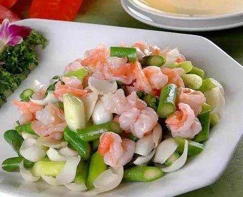 做法:1、蝦仁去黑線,一分為二,蘆筍去表皮洗凈後切小段,大蒜切片;