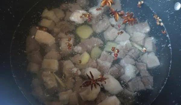 2.炒鍋內加入適量的冷水,然後再把準備好的牛腩放進去。放入蔥薑、花椒洋蔥去腥,不用蓋蓋子,大火燒開。水燒開後轉中火繼續煮沸五分鐘後撈出。