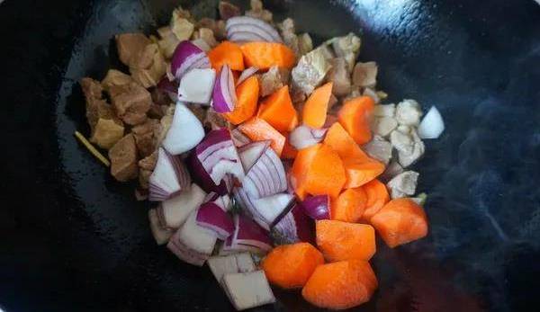 4.炒鍋燒熱放入食用油,油熱後把準備好的牛肉放進去用大火煸炒出水分。把裡面多餘的湯汁炒出來。然後在裡面加入準備好的西紅柿和洋蔥丁。再次翻炒兩分鐘。往裡面加入生抽、老抽、白糖、精鹽調味兒。