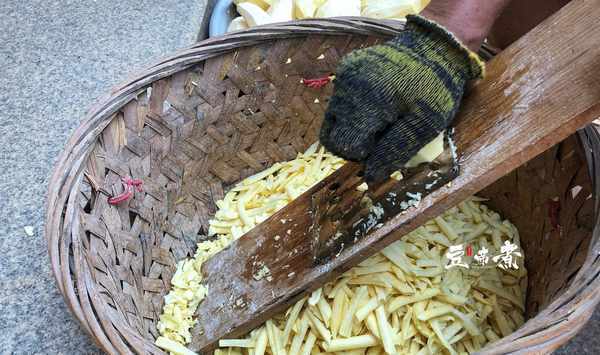 削好皮的番薯就能開始擦成絲了,在擦絲的時候拿一個籃或者是盆。把擦絲器斜放再拿一個番薯進行刨條,刨的時候第一注意手的安全。再來番薯要拿直,呈現垂直的狀態。切勿自作聰明刨成長絲條,這樣的番薯簽幹會帶薯筋影響口感。