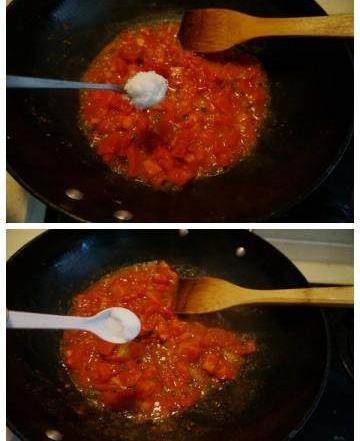 8.待西紅柿塊炒出些許湯時,加入一小勺白糖,既可以提鮮,又可以中和一下西紅柿的酸;
