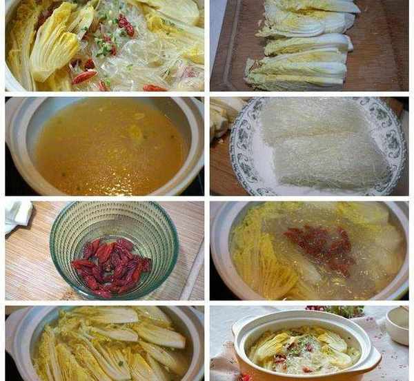 材料:娃娃菜兩顆,龍口粉絲兩小把,枸杞一撮,雞湯適量,鹽適量