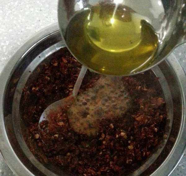 (8)慢慢將油全部倒入,油一定要沒過辣椒和芝麻,喜歡辣椒油的,可以多放點。