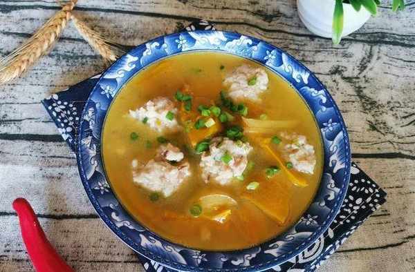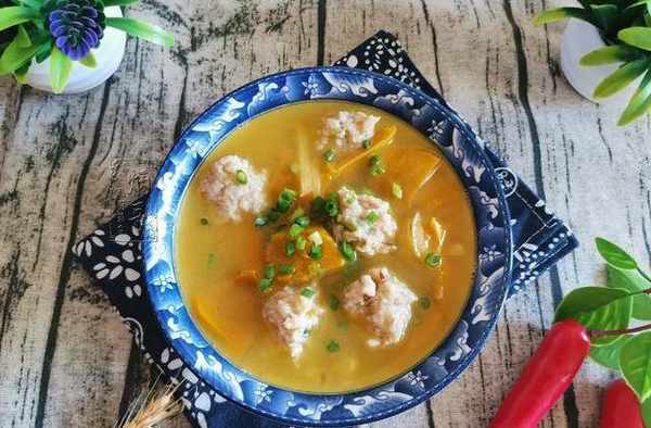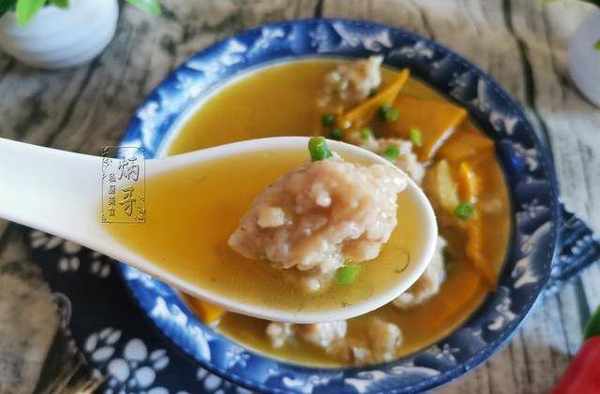 14、將我們精心制作好的南瓜丸子湯從鍋內小心盛放到提前準備好的碗裡後,就可以放心食用瞭。