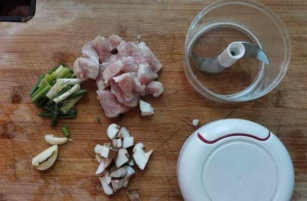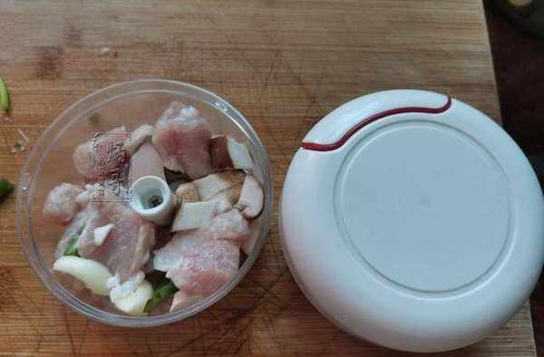 2、將切好的豬肉、香菇、大蒜都放到準備好的拉蒜器裡面。我們剛才將豬肉切成小塊就是為瞭方便放入拉蒜器中進行操作。