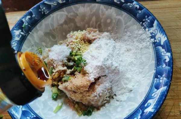 5、隨後取出傢中常用的大小合適的幹凈的碗,將我們的肉餡倒入碗裡面之後,再加入適量的面粉以及食鹽和味精以及之前切好的蔥段也一塊放入其中,最後倒入適量的生抽用筷子攪拌均勻後,先放在一旁醃制。