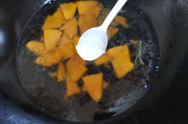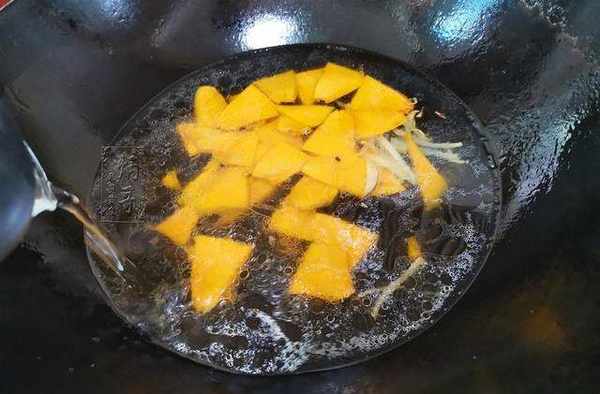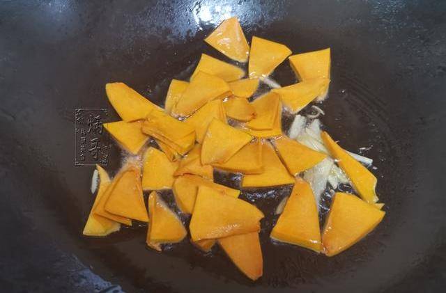 8、直至將鍋裡的生薑炒出明顯的香味之後,我們就可以將準備好的南瓜也一塊下鍋和生薑一起煸炒。
