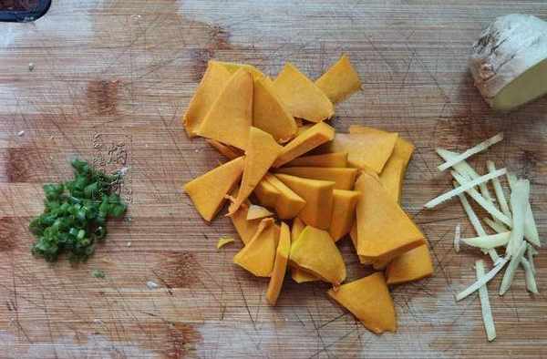 6、隨後我們就可以開始著手這次要用到的其他食材。將南瓜用清水沖洗幹凈之後,削皮去瓤後切成自己需要的小塊即可。生薑洗凈後切成薑絲,蔥洗凈之後用刀切成小段。
