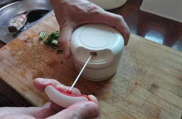 3、隨後合上拉蒜器,將拉蒜器來回拉動十次左右就可以將豬肉以及香菇等食材制作成肉泥狀。
