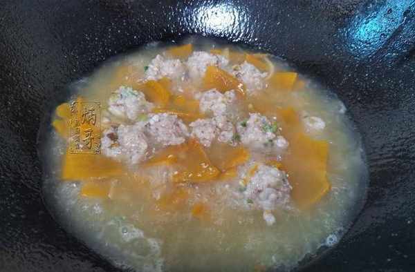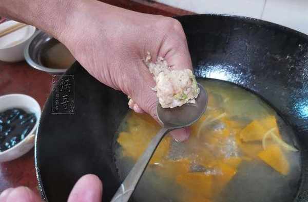 12、直至將鍋裡的水煮開後,我們就取出之前醃制的肉餡,用洗凈的手擠出丸子下鍋熬煮即可。