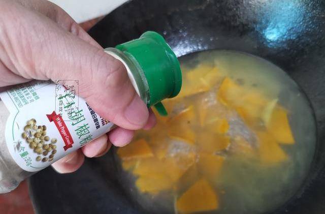 11、加好鹽後再加入適量的胡椒粉,加入胡椒粉之後我們的南瓜丸子湯味道會更加富有層次感。