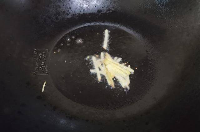 7、把以上的食材都準備好瞭,就可以開始起鍋熱油瞭,取出傢中常用的幹凈的鍋,碗裡面加入適量的食用油,隨後開大火候將油溫持續加熱至六成左右的時候,就把切好的薑絲下鍋煸炒爆香。