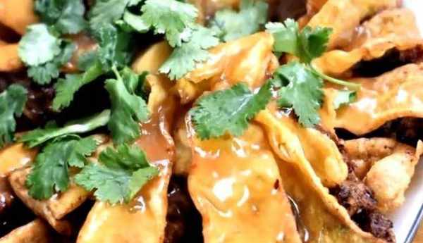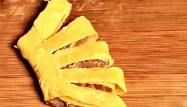 4:把調好的肉餡抹在雞蛋餅上面,不要抹很多瞭,大約抹在雞蛋餅的三分之一就可以,抹多瞭待會炸的時候不容易熟,用蛋皮將肉餡裹起來,切成三個梯形,在每個梯形上面切上幾刀,但是不要切斷瞭。