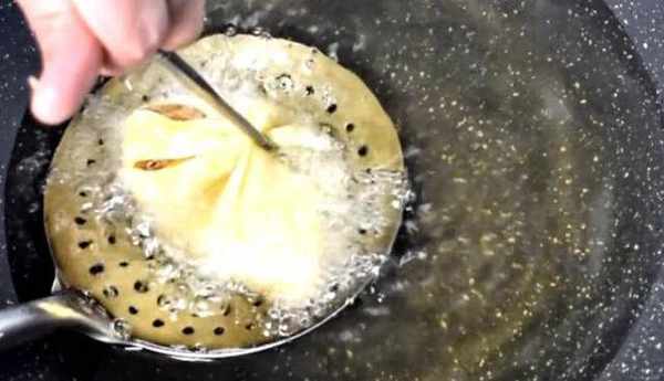 3:炸蛋卷的時候,先把蛋卷放在漏勺裡面,筷子夾起一端,炸到定型後,讓蛋卷離開漏勺就可以瞭。