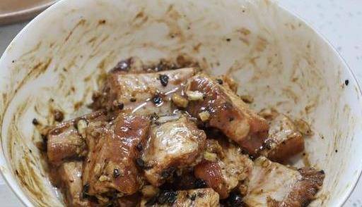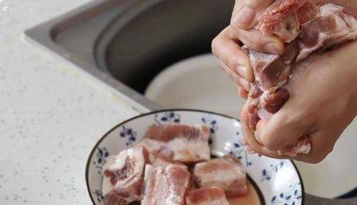 第二步:這個時候排骨裡面還會殘留水分,如果帶到鍋裡的話,一會可能會不入味,所以這個時候就要用手把水分擠出來。