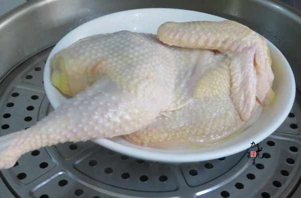 2、鍋裡加入一大盆清水,等水燒開後,放上蒸托,盤子底部放上香蔥再放雞肉上鍋蒸。熱水蒸雞,肉更鮮更嫩。