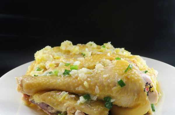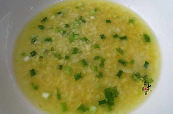 4、黃薑和大蒜洗凈用到剁碎,燒熱鍋後,加入一勺花生油,開小火爆香薑蒜末後出鍋,倒入一小勺食鹽和蒸雞剩下的盤底雞油,然後撒入蔥花攪拌均勻。蔥油雞,蔥,薑,蒜這3種配料不可缺少。