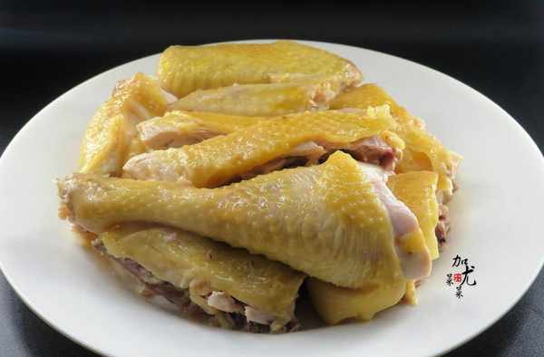 5、雞肉趁微熱剁成小塊,擺入盤中。