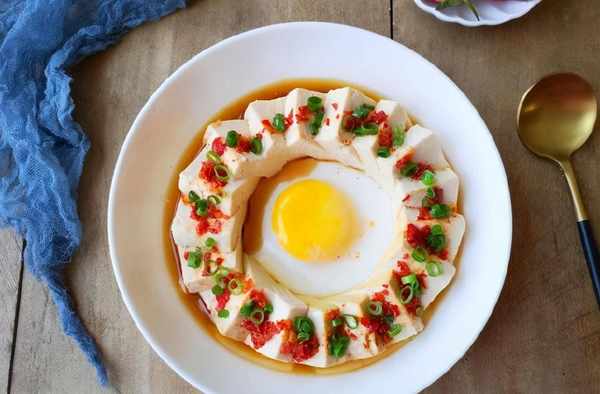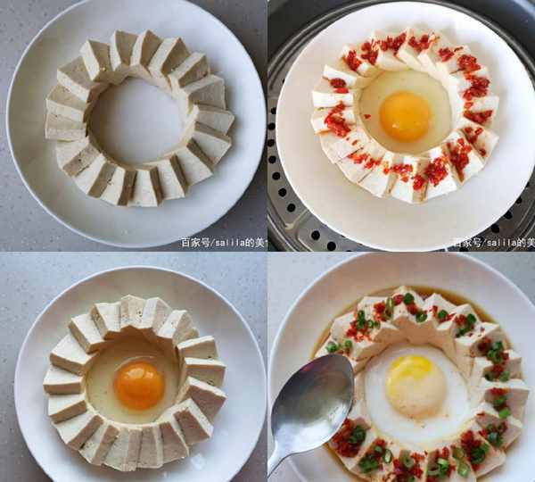1、盤子底部中間位置刷一層薄薄的植物油,豆腐切成大小差不多的方塊繞著盤子擺一圈,中間留出一個圓形出來。如果不想雞蛋粘在盤底,盤子刷油這一步最好不要省略。