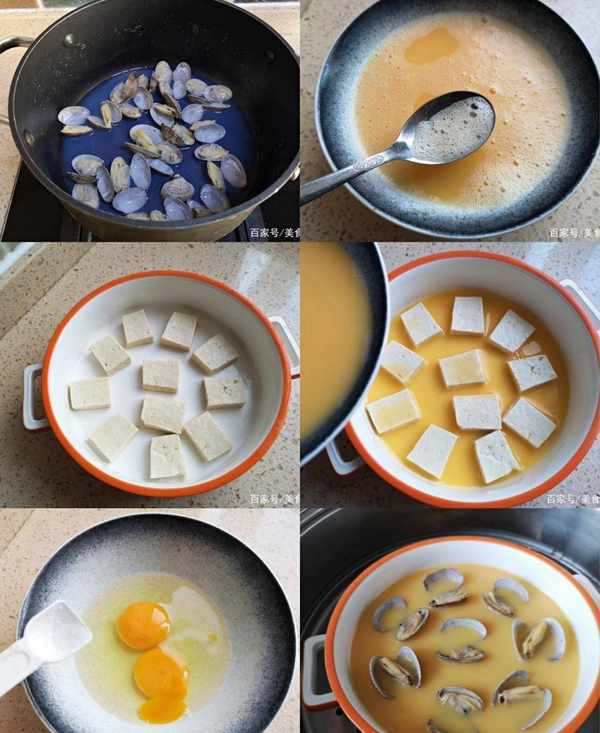 準備食材:豆腐一塊,雞蛋兩個,蛤蜊一小碗,鹽適量,料酒少許,生抽一小勺,香油少許