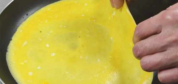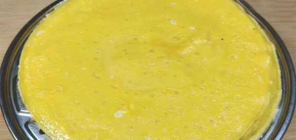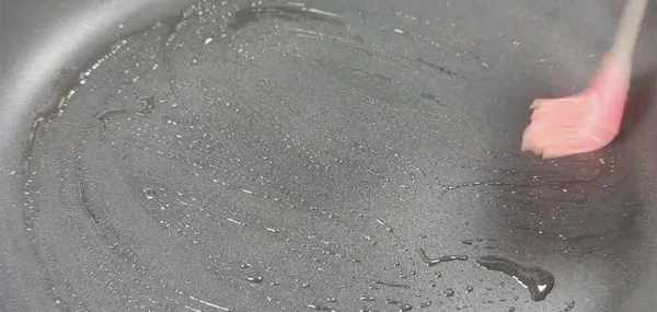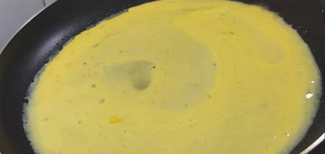 12.平底鍋燒熱,用刷子刷一層油,然後倒入一勺雞蛋液,輕輕地轉動鍋子,把雞蛋液攤均勻,攤雞蛋皮的過程中,要全程保持小火,這樣不容易糊底。
