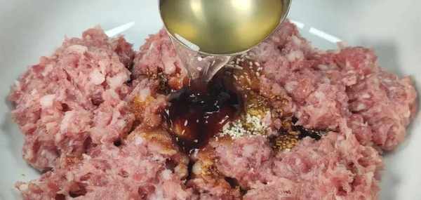 8.攪拌均勻後再加少許芝麻香油,再次攪勻就可以瞭,香油可以給肉餡增香提味。