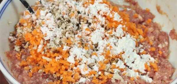 7.把香菇和胡蘿卜丁加到肉餡裡,這樣吃起來口感更有層次,而且也更加營養。再加一小勺土豆淀粉,用筷子攪拌均勻。淀粉的量不要加太多,加太多瞭口感發硬。