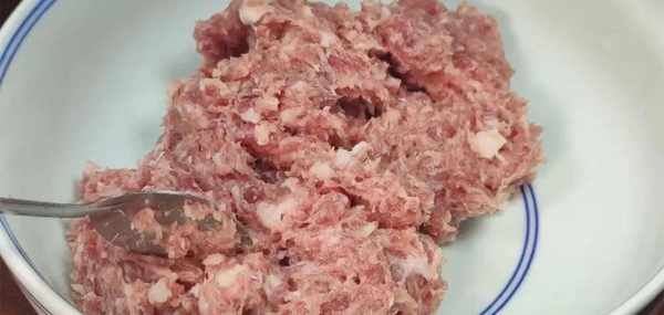2.今天買瞭一斤多的豬前腿肉,前腿肉的肉質比較鮮嫩,去掉豬皮後,用絞肉機攪成肉餡,裝到碗中備用。