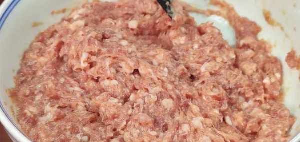 6.肉餡充分吸收料汁後,再加兩勺蔥薑水,然後沿一個方向把肉餡攪拌至上勁。蔥薑水的用途是給肉餡去腥增香,達到嫩滑的口感,所以也不用加太多,水太多瞭肉餡反而不宜成型。