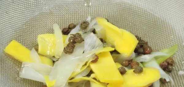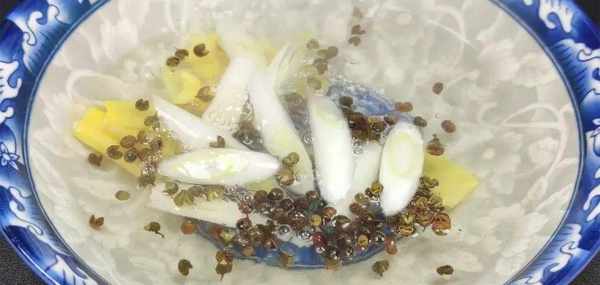 1.首先準備一點蔥薑水,碗中加入少許花椒粒,適量的蔥段和薑片,加入溫水浸泡10分鐘。