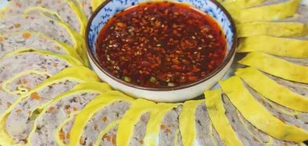 17.時間到後把鮮肉蛋卷取出來,放涼後斜刀切成厚片,然後一片片擺到盤子中,中間放上調好的蘸料,這樣一道簡單營養、好吃又好看的鮮肉蛋卷就做好瞭。