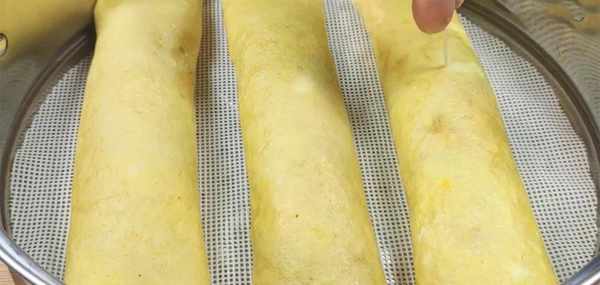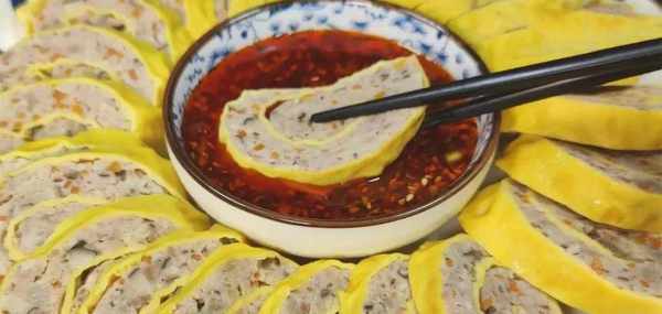 鮮肉蛋卷:豬肉、雞蛋、蔥薑、花椒、香菇、胡蘿卜、鹽、胡椒粉、雞精、生抽、蠔油、香油、淀粉