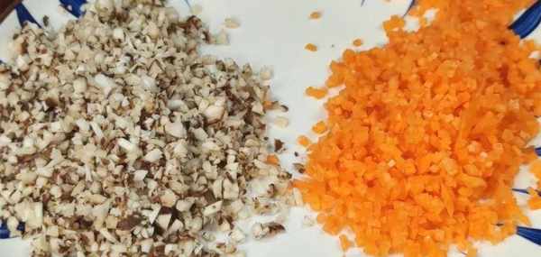 3.準備一點香菇和胡蘿卜洗凈,都切成小丁,裝盤備用,如果切的感覺有點大,可以再用刀剁碎一點。
