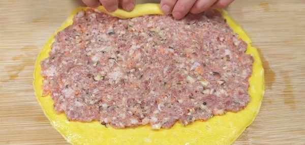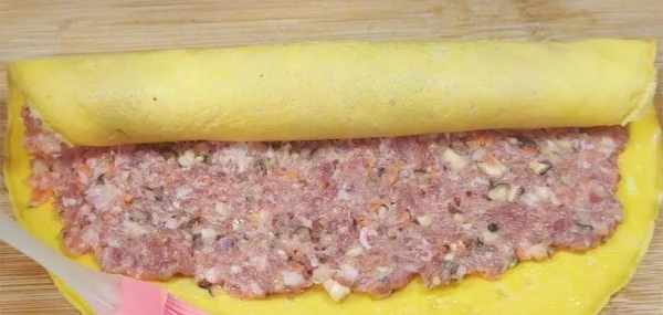 14.把肉餡均勻地平鋪在雞蛋皮上,然後從一頭卷起來,卷緊實一點,這樣做好不容易散,最後的部分刷一點雞蛋液,這樣能夠粘的更牢固。
