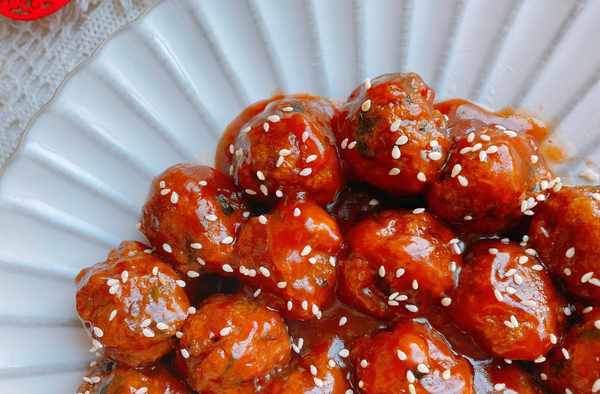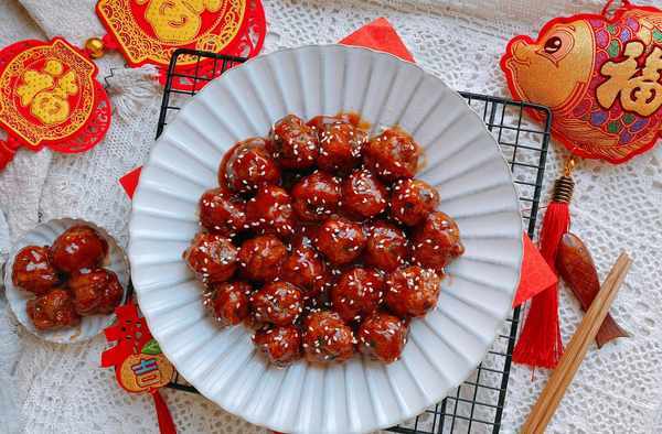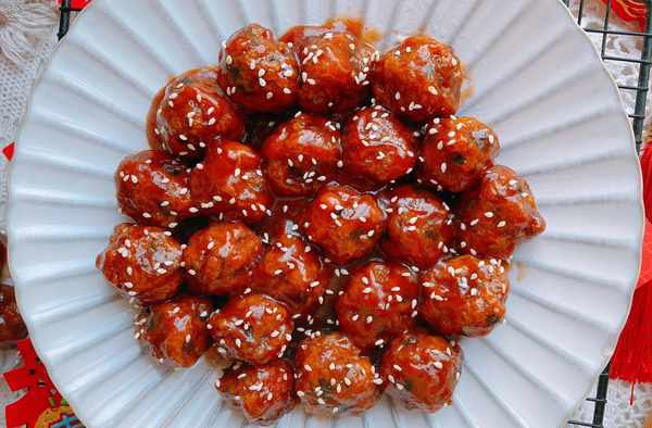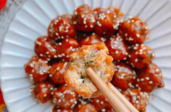 6、裝盤的糖醋丸子上可以撒上適量的白芝麻點綴,酸甜可口,外酥裡嫩的糖醋丸子完成,祝你新的一年團團圓圓;糖醋丸子建議是放在最後做,做好就可以直接開飯瞭,做好長時間不吃會導致丸子變軟,影響口感;