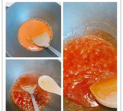 4、鍋中留一點底油,下入糖醋汁,開小火,慢慢攪拌,慢慢的顏色會變深,鍋中糖醋汁開始冒泡泡的時候,加入一勺熱油,熱油能讓糖醋汁的顏色更好看;